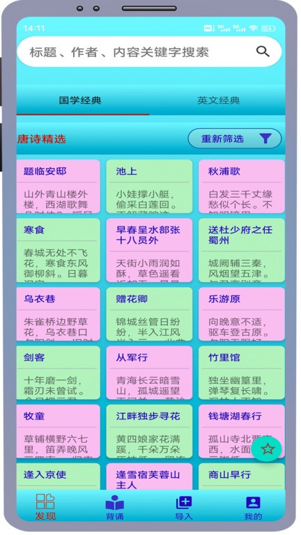 软件还支持自定义导入内容,比如你想学的东西不在系统里,也能轻松加进去。还有点读和意思讲解功能,这样背诵的时候不仅能记住,还能理解其中的意思,学习效率直接翻倍!对于学生党来说,这个软件简直就是神助攻,尤其是复习模式,能很好地巩固知识点。