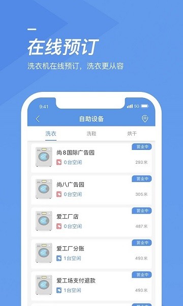 智能预约洗衣机,通过软件可查询当前校园内空闲的洗衣机,查找到离自己最近的洗衣机进行手机达成一键预约。