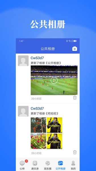 心桥聊天交友软件跟平时常用的微信、qq差不多;但是,它是属于比较小众的社交app。软件可以用于发送文字、视频、语音等,满足不同沟通场景的使用需求;支持建立群聊,拉多个好友一起畅聊,多人聊天相信会更开心的。