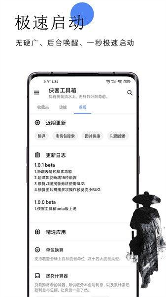 侠客工具箱提供了与文字、图片、音视频处理、设备、清理、文件、计算、查询、相关的100多种工具,基本满足您在日常使用手机时的所有工具需求。