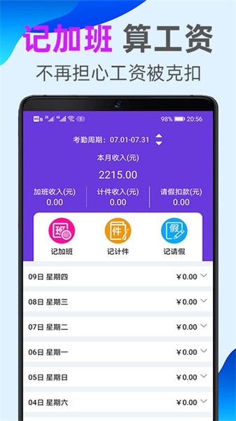 加班请假考勤随手记,自动精选计算工资,工友们都在用的记加班、加工资记账软件。