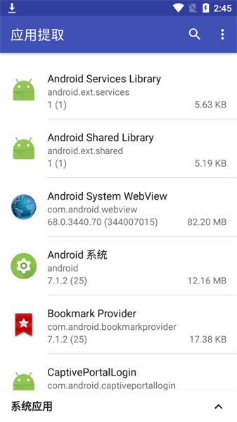 3、支持用户下载的应用以及系统应用的详细区分,还有一个一键搜索,对于应用比较多的乐友这样操作更方便