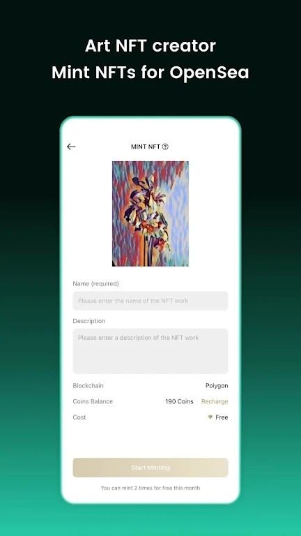 使用GoArt将人工智能生成的艺术品制作成NFT。只需轻轻点击几下,您就可以将照片变成独特的NFT加密艺术品,并在NFT市场上进行交易。