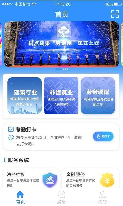劳通用手机版是主要提供劳动就业服务管理的办公化平台,通过登录即可使用,覆盖建筑行业、非建筑行业、劳务调配等领域,不仅可以帮助故那里行业中的考勤、薪资、项目,还可以帮助快速寻找合适工作,支持考勤打卡,更具备法务维权、金融等功能!