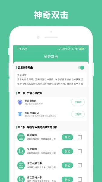 为了更一步提供使用效率,软件还提供了神奇双击功能,用户无需打开软件界面,在手机任意空白地方双击即可触发对应功能。比如:双击截图、识别二维码、提取文字、打开某个app等。