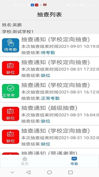 3、学生登录App进行激活测试,收到抽检通知后完成识别,显示学生的抽检记录。