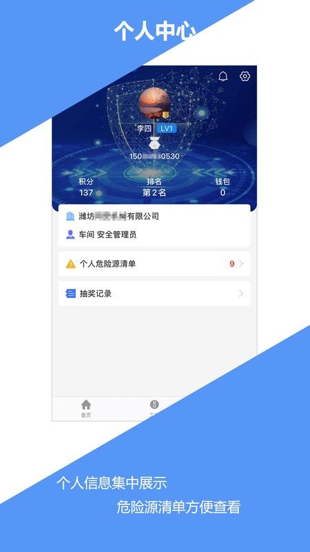 首页展示员工及企业的隐患排查统计数据;发布页可由员工提交隐患给公司安全员,公司安全员负责进行隐患整改安排与整改完毕后的审核。