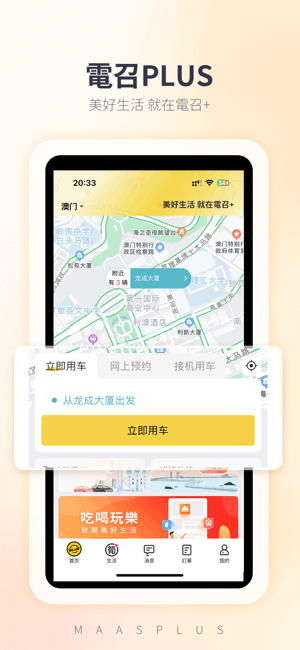 【澳门电召】APP正式升级并更名为【电召PLUS】,【电召PLUS】致力于发展智慧出行新生态,打造集合电召的士、港澳快线等多种出行方式,辐射周边生活、购物、旅游等配套服务,覆盖吃喝玩乐、衣食住行的一体化、多场景综合服务平台。