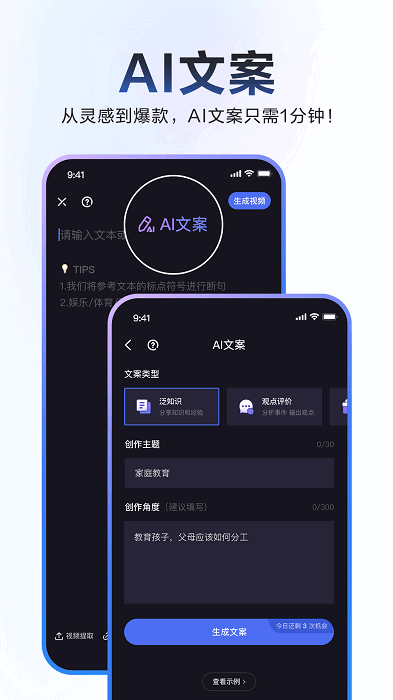 【AI文案】选择文案类型,输入创作主题和创作角度,即刻生成文案初稿,审核修改即可一键成片。