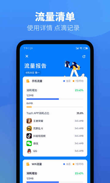 每日流量是一个集手机流量统计、网络测速优化、手机内存清理等功能与一体的工具产品.通过大数据分析统计、可视化图表展示,让你对wifi/5G/4G流量动向一目了然,同时用户还可以自定义流量提醒,再也不用担心流量超标啦!