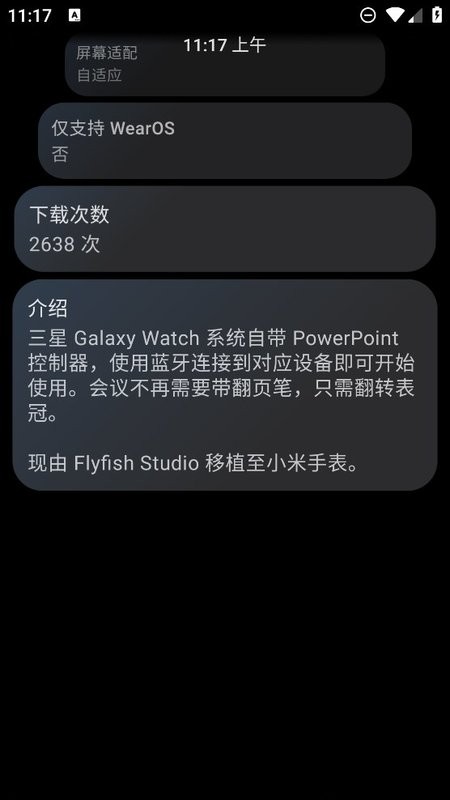 三星ppt控制器是手表版的应用工具,做你的腕上助手。是三星galaxy watch系统自带powerpoint控制器,使用蓝牙连接到对应设备即可开始使用,会议不再需要带翻页笔,只需翻转表冠。体积十分小巧轻便,界面布局简单,可以自定义适配屏幕大小!