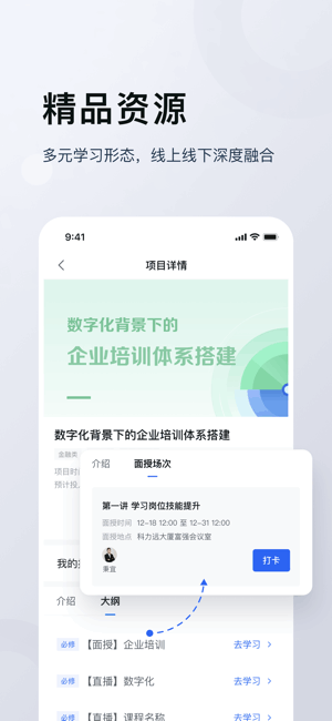 未来学堂最新版是提供掌上教育培训学习的应用app,面向企业员工,带来丰富的资源内容、集项目、课程、专题、地图、☞学达人、资料、调研、考试、资讯等服务为一体,线上线下相结合,热门项目推荐学习,学习任务一目了然,员工学情实时记录,随时查看!