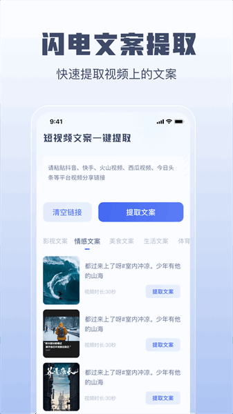 闪电文案提取软件是一个功能十分强大的手机文案提取神器,内置强大的扫描提取功能,可以在线对各种文件进行拍照提取等,整个操作过程也十分的简单,轻轻松松就能提取所需内容,实用性极强,有需要的朋友快来下载用起来吧~