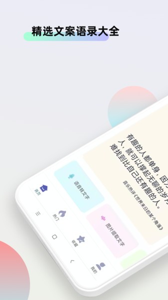 文案助手软件又称文案素材大师,是专门用来提供文案素材资源内容的应用app,界面高清简约,覆盖各种各样不同类型的文案,每日推荐好文金句,随时阅读欣赏学习,还支持拍照提取文案,在线记录并收藏喜欢的文案素材,使用十分方便!