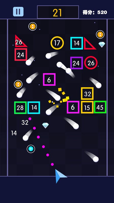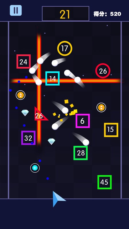 5.每次弹珠击打一次方块都会获得分数,在方块到达底端前尽可能的获取高分。