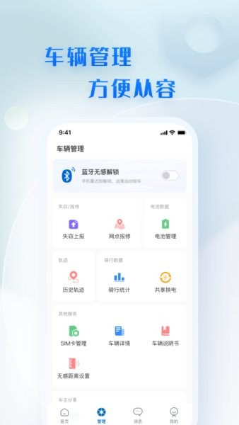 1、摆脱传统车钥匙:支持蓝牙无感开关锁,APP远程开关车锁、一键寻车,失窃上报