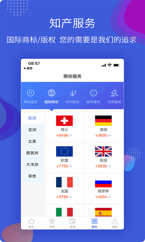 32知协官方版是提供商标注册、查询、交易服务的办公化平台,涵盖海量的商标库,可以一键查询了解,在线注册使用,还提供商标交易,即买即用,支持国际商标/版权,带来一站式服务体验,操作简单又方便,满足企业或者个人的需求!