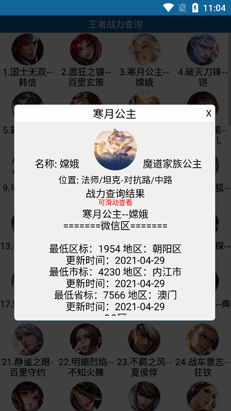 2、支持查询英雄战斗力,查询最低区域,提供省份列表和时间信息
