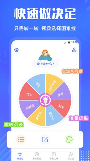 大转盘快决定:选择困难的你每天都在纠结:今天吃什么?明天穿什么衣服?周末去哪儿玩?快决定就是帮助你做小决定的APP。小决定大转盘通过转盘的形式,让你轻松做决定。同时提供趣味转盘、答案之书、真心话大冒险等有趣的内容。