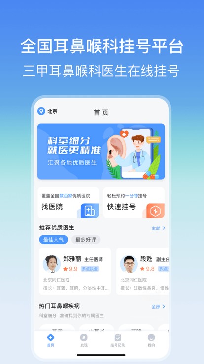 耳鼻喉医院挂号平台为大众提供在线咨询、网上预约挂号服务,汇集多家综合医院、专科医院的专家医生号源,APP快速预约挂号,远离加价排队,就医不求人。