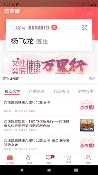 圆爱康医护端APP是盆底医者的线上管理工作平台,方便医者进行管理病历档案、调整训练方案、推送定制方案。是盆底医者的线上工具百宝箱,可随时在平台上进行学术交流、案例分析、论文分享,可随时发现近期的盆底相关学术会议,可随时寻找专业的临床指南、专业文献。