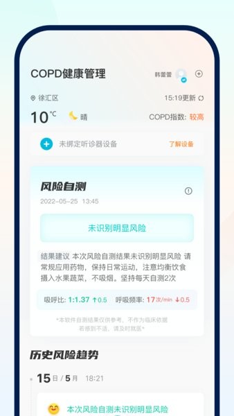 智呼吸慧健康app最新版软件提供了非常贴心的哮喘服务,与硬件相连接以后可以直接在手机上查看测量的各项数据,根据数据会给出非常详细的评估报告,能够详细的记录呼吸音,还可以查询历史记录。