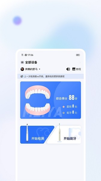 用app连接美伢日记智能牙棒硬件设备,可实时查看牙齿情况,3分钟完成刷牙检测,生成牙齿导航系统,并根据刷牙情况为你智能定制刷牙方案。