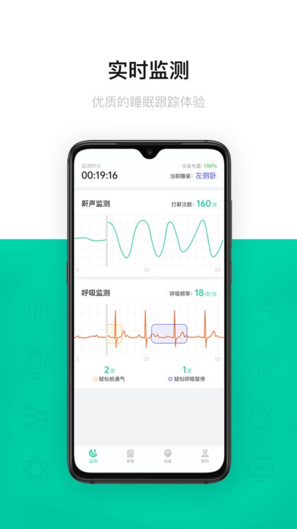 呼吸监测,对于用户不同睡眠状态下的呼吸情况进行统计让你能够了解。