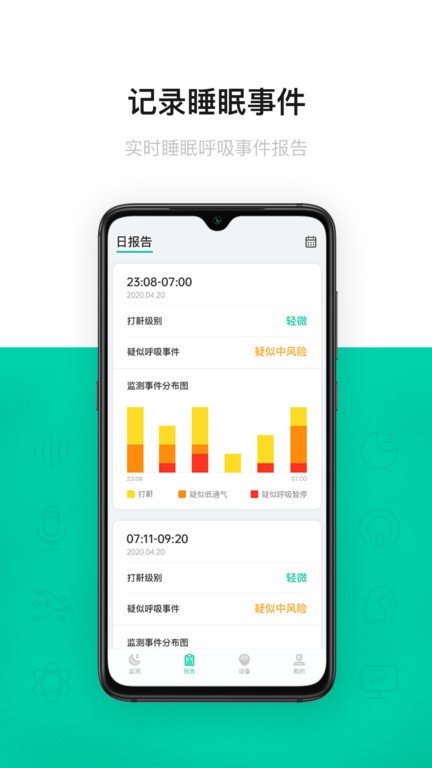 拥有丰富的日报告内容,该报告中展示了打鼾级别、疑似呼吸事件和监测事件分布图等;