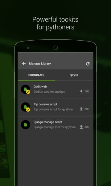 4、拥有python解释器以及qrcode阅读器和qpypi等实用的功能,功能齐全以便你轻松开发应用。