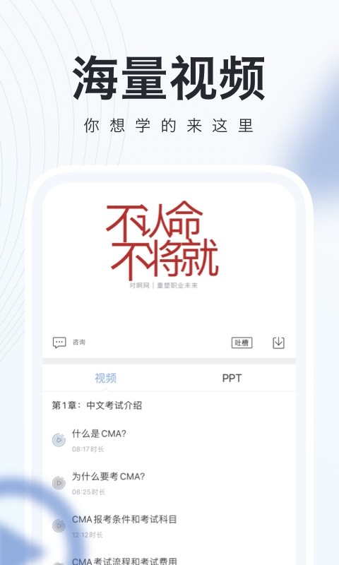 对啊CMA考试随身学最新版是对啊网旗下为备考会计师打造的线上的教育学习平台,拥有大量干货公开课,考试要点一网打尽,海量视频可以随时在线学习,还精编题库专题内容,不断复习巩固,针对性训练,帮助大家查漏补缺,高效备考!