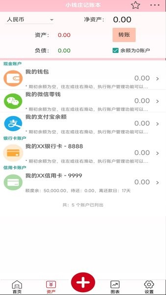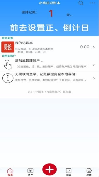 2、首页账本列表只有一个空的账本、资产页面也只有几个空的账户,所有的图表也是没有数据的。