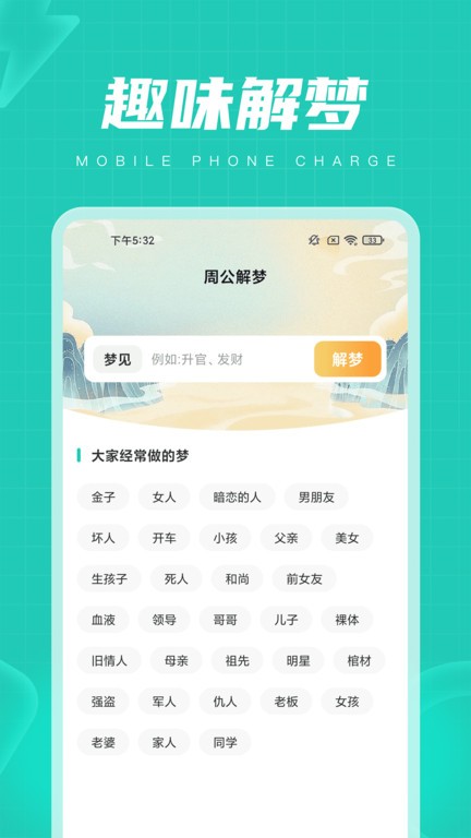 【趣味多多】软件在提供电池电量显示的同时,还开辟了星座测试区、解梦区,多款趣味功能等你发现,快来看看吧~