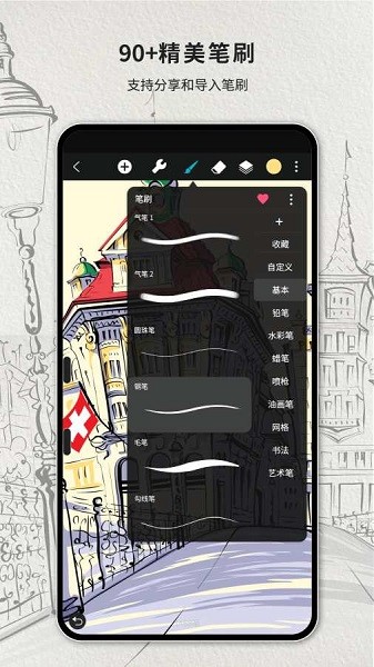 包含60+种形式多样的笔刷,并有多种笔刷参数可调节。