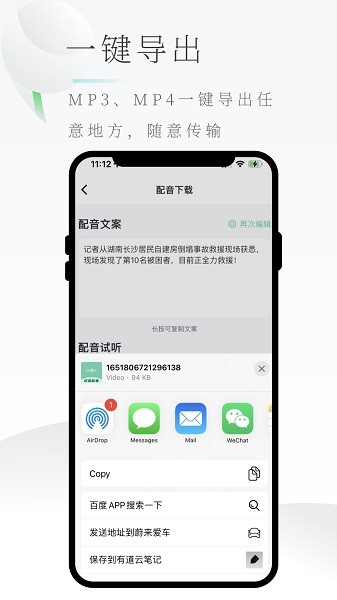 1、一键文本转语音合成,一键导出MP4,MP3音频格式到手机,电脑,内存卡,U盘或分享给朋友,并支持朗读试听试用。