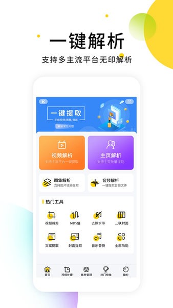 这款软件可以提供一键解析无水印短视频素材,视频音乐提取、本地视频去水印、视频剪辑处理等实用功能,具有批量解析主页亮点。