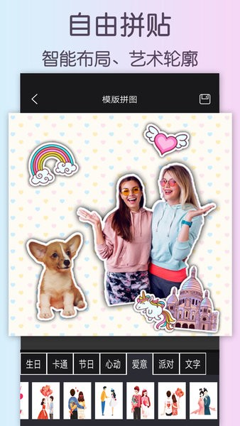她拥有超过20多个贴纸素材,并且支持在线更新,及时为您提供流行的贴纸元素。