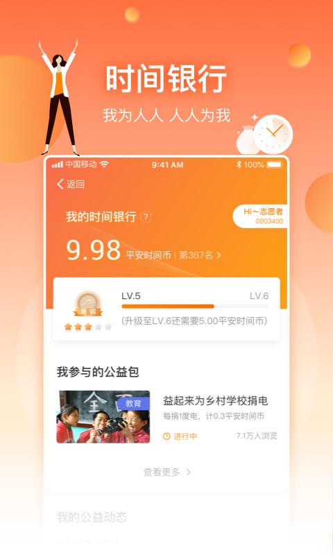 三村晖APP是中国平安三村工程项目的线上公益平台,2019年全面升级为“三村晖时间银行”,用参与公益服务的时间来量化志愿者的付出,并借鉴银行的“当下存储,未来支取”的兑存模式,来实现志愿者群体互利共赢的公益新形态,打造“我为人人、人人为我”的智慧公益互联网互助平台。