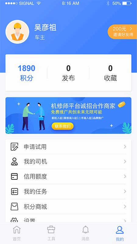 4、进入工具页面,能够实时查看车辆的信息,工作的地方和各项数据信息
