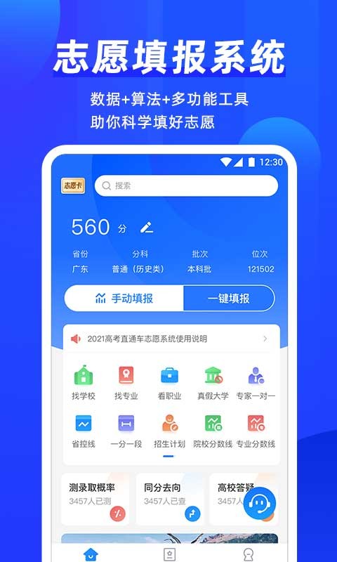 高考直通车志愿版app最新版为广大的考生和家孩子和家长用户提供了志愿填报服务,这里有丰富的院校和专业信息,能够一键智能填报和手动填报,可以根据自己的分数测试录取率,能够查看历年的招生分数线。