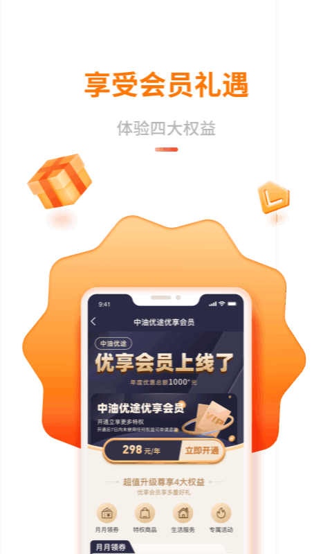 中油优途最新版本是一款提供汽车路途加油服务的应用软件,可以在线申领电子加油卡,还可以享受会员礼遇,享加油优惠,更提供汽车服务,有线商城方便车主朋友选购,能够支持一键查询周边的加油站位置,出行更加方便,便利大家的生活!