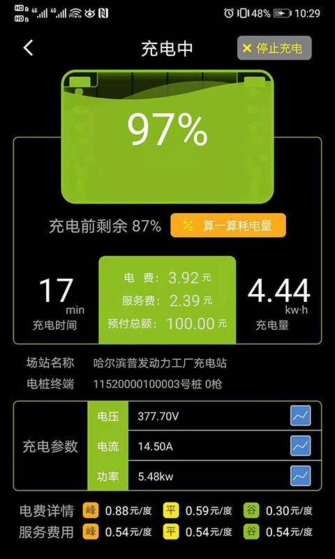手机支付充电费用,结束充电之后对于账单上的费用可以直接在这里完成支付;