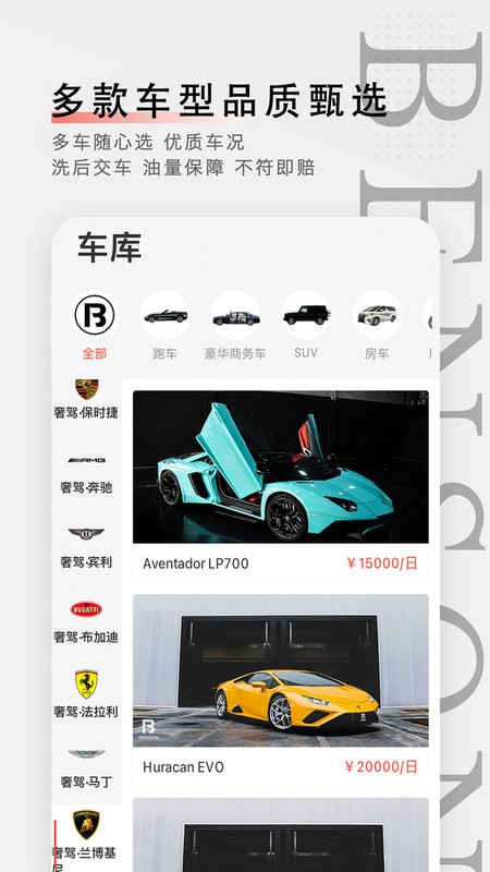 自有各类品牌的豪车达几百辆,另有挂靠车数上千辆,均可在全国任意地点使用。 品质是本森的象征。每辆车都经过本森专业检测,以上佳车况迎接每一位客户。
