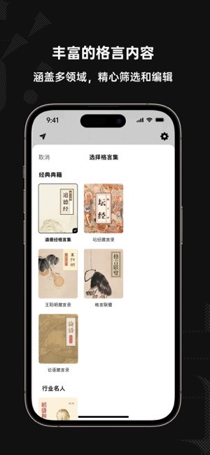 -- 经典典籍、行业名人、心灵成长等任你选择,还支持在线添加名言,个性化设置