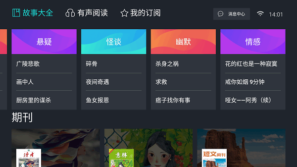 励志、世态、传奇、悬疑、怪谈、幽默、情感等故事分类齐全;还有 期刊、笑话集锦