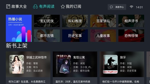 热播小说、新书上架随你选择;玄幻武侠、科幻推理、百家讲坛、都市言情、历史军事、相声评书、儿童故事、恐怖惊悚等题材一网打尽
