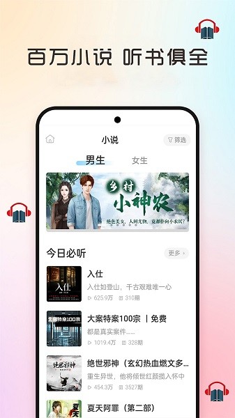 上百万部各类题材小说实时更新,涵盖玄幻、奇幻、都市、言情、校园、历史、武侠、仙侠、侦探、军事、豪门、科幻、灵异、霸道等十几个全面分类,每月保持8000小时新鲜有声小说内容更新;汇聚了当下热门芈月传奇、左耳、余罪、欢乐颂、翻译官、盗墓笔记、鬼吹灯等热门小说、全本小说、网络小说、畅销文学为一体的小说听书平台!