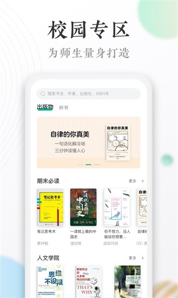 现有海量正版出版物电子书,听书资源,内容涵盖小说、文学、励志/经管、社科、生活等品类。针对校园专属阅读场景定制,丰富阅读体验,让大家随时随地,想读就读~