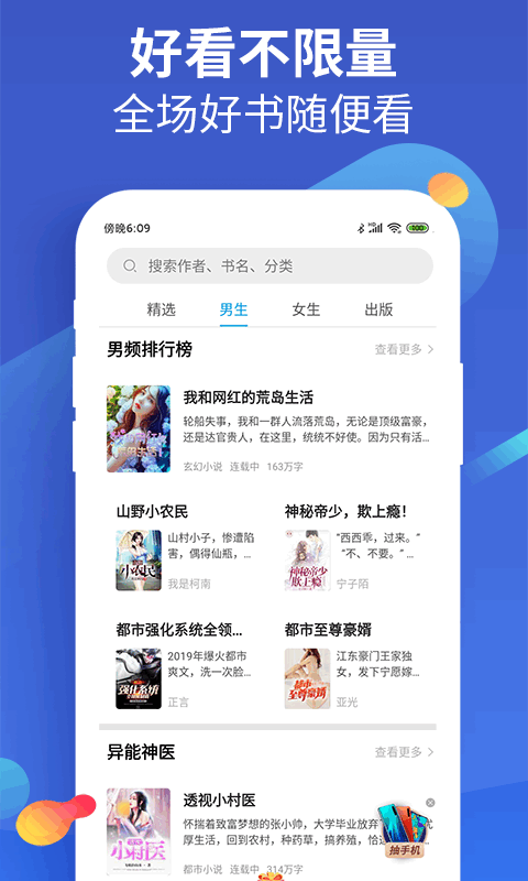 -- 网络原创、出版新书、文学艺术、现代乡村都市言情、婚姻生活、灵异玄幻、仙侠武侠、历史军事,同人小说、二次元小说、权威小说榜单,感受不花钱看好书的快感。