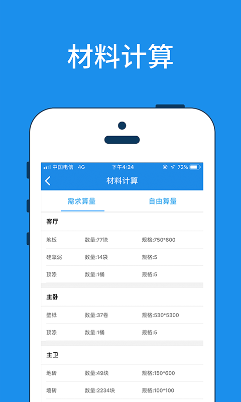 2.材料计算:选择主材规格,自动计算主材用料单;